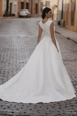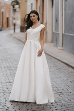 A classical bridal gown made just for you! The fitted bodice is beautifully adorned with sparkling sequined lace appliques and beaded belt that will accentuate your waistline, V-neck and thick straps completed the top. The delicate lace flows onto the flowy mikado skirt with train that will sway with every step you take going down the aisle. Perfect for your special day! Give us a call at Terry Costa for more details on this stunning bridal gown!