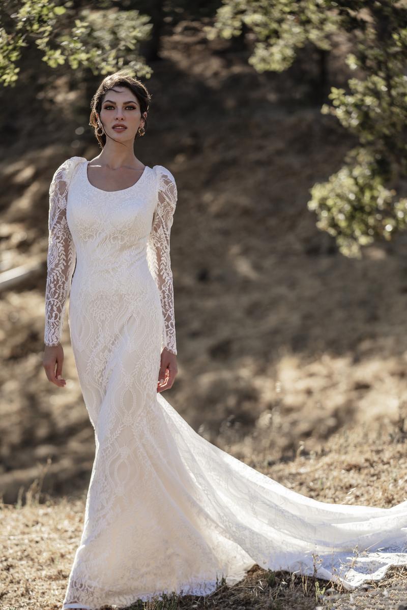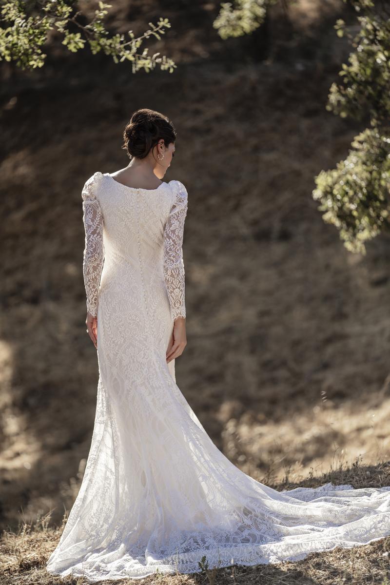 Feminine sheet lace covers the bodice and skirt of this long sleeved sheath - leading to a chic puffed sleeve.
