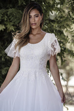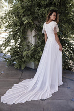 This A-line chiffon gown is finished with an appliqud bodice and tulle butterfly sleeves.