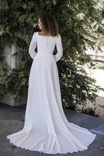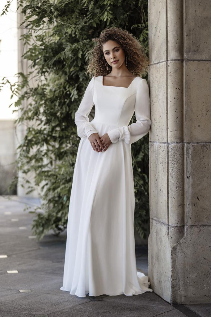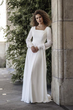 Worthy of our iconic 70s-inspired brides, this sleek A-line gown is accented with long chiffon sleeves.