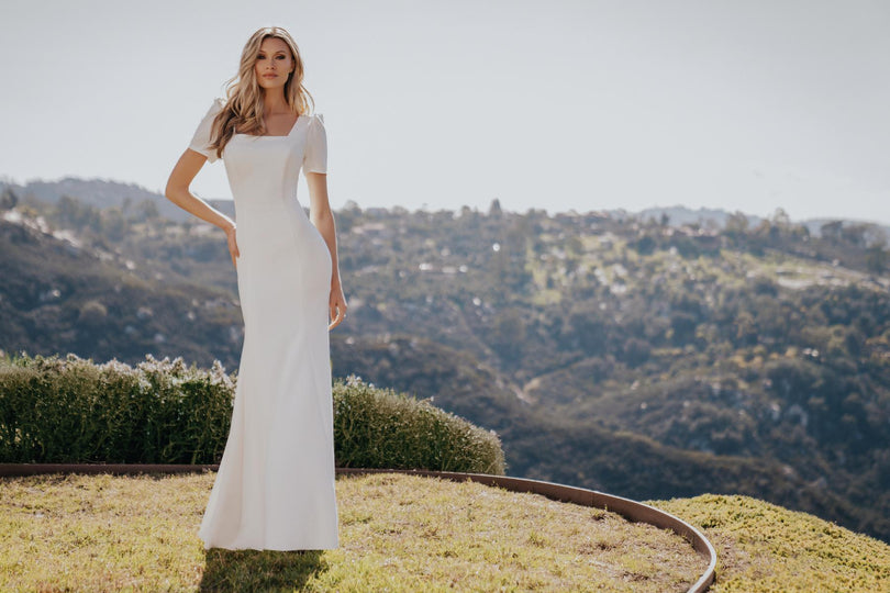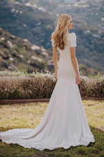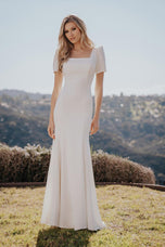 Chic crepe composes this short sleeved gown.