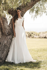 A flowing, romantic skirt pairs beautifully with this bridal look's cap sleeved bodice.