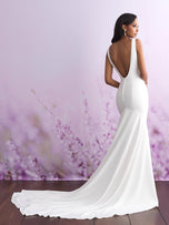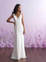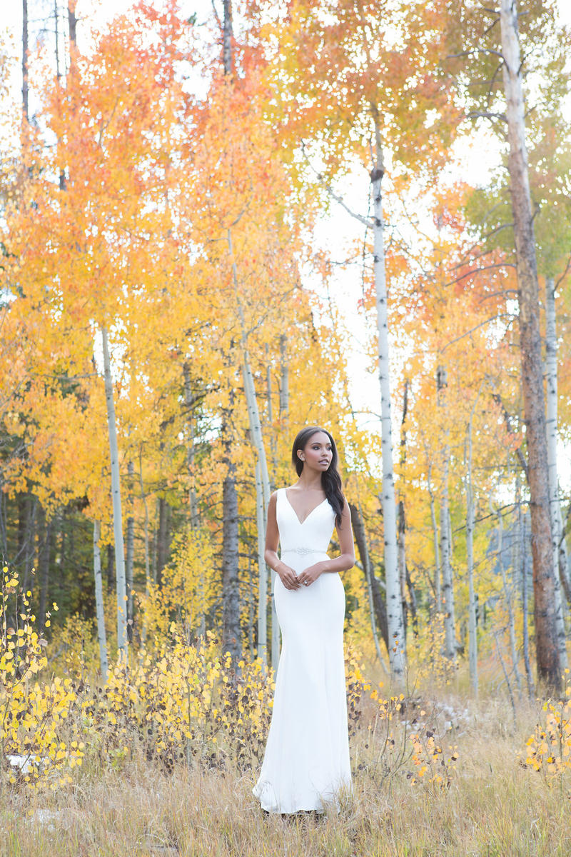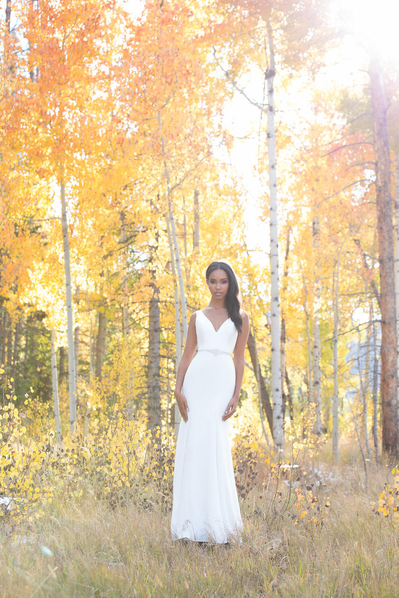 Clean, elegant and minimalist, this is style 3103 from the Allure Romance 2018 bridal collection. Effortlessly chic, this sleeveless style features a v-neckline and romantic train. Made of crepe, this style is perfect for your destination wedding, reception or formal bridal gown. Please call our Dallas, Texas location to check in-store availability current ship dates, and/or pricing.