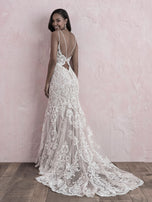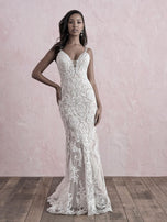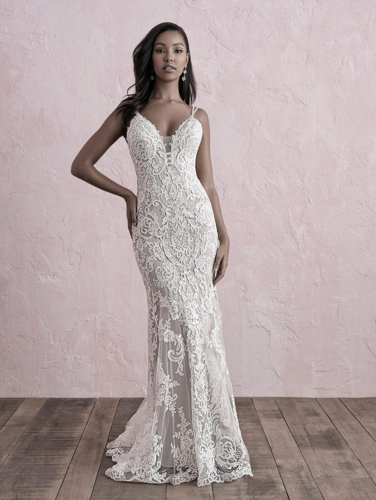 We're in love with the keyhole back, delicate straps and lace appliques on this gown, a fabulous fit and flare from Allure Bridal's Romance collection. This affordable wedding dress is a perfect centerpiece for your formal church wedding or even a romantic destination bridal gown or outdoor ceremony look. Vintage-inspired lace appliques adorn the gown throughout the bodice and simple flared skirt. Please call our Dallas, Texas location to check in-store availability, pricing and current ship dates.