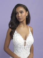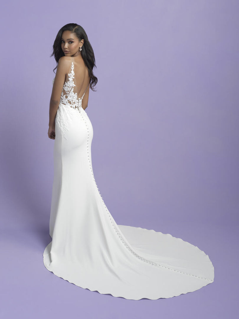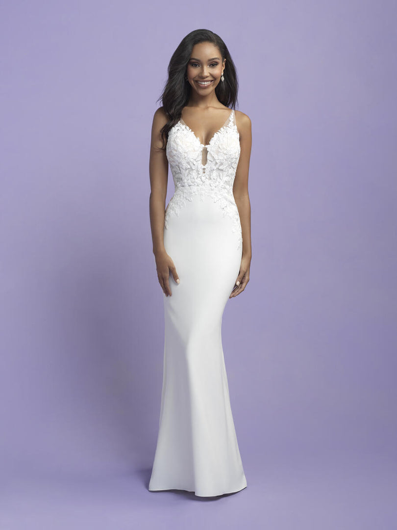 A sexy sheath for the bold bride, were obsessing over style 3403 from Allure Bridals 2021 Romance bridal gown collection. The beauty of the delicate illusion back detailing on this sheath paired with a flattering, plunging v-neckline makes this boho-inspired look a perfect fit for your formal church wedding, reception gown or destination wedding dress. A versatile look that will look fabulous from all angles (hello side cutouts!) we know youll feel like a princess when you arrive at your whimsical wooded wedding wearing such a romantic and sophisticated wedding dress! Please call our Dallas, Texas location to check in-store availability, pricing and current ship dates.