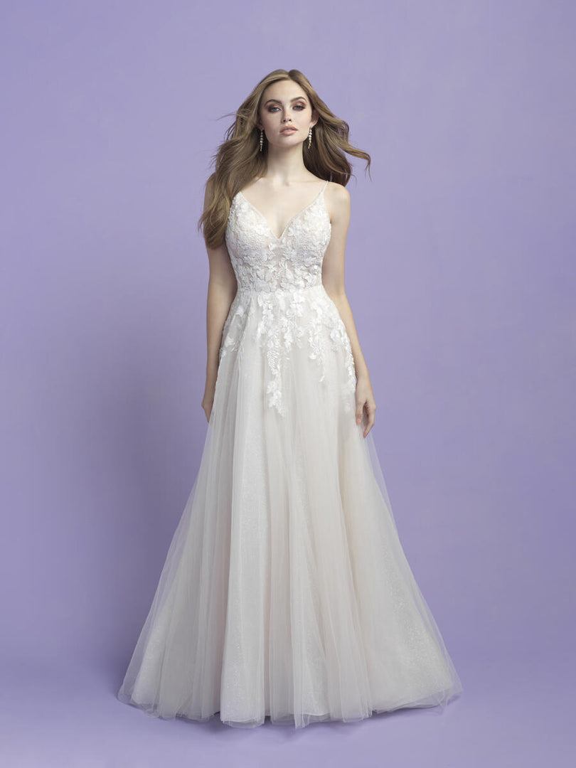 Fit for a princess and full of romance, style 3410 is a classic bridal gown for the modern yet sophisticated bride. Delicate, boho-inspired lace appliques adorn the bodice of this A-line bridal gown, a picture perfect pic from Allure Bridals affordable 2021 Romance Bridal Gown collection. Featuring comfortable yet delicate illusion straps and a soft, ethereal tulle skirt, were loving the idea of floating down the aisle at your outdoor destination wedding or wintry wooded bridal ceremony! An a-line silhouette makes this look perfect for almost any body type, from hourglass to apple to pear-shaped! Please call our Dallas, Texas location to check in-store availability, pricing and current ship dates.