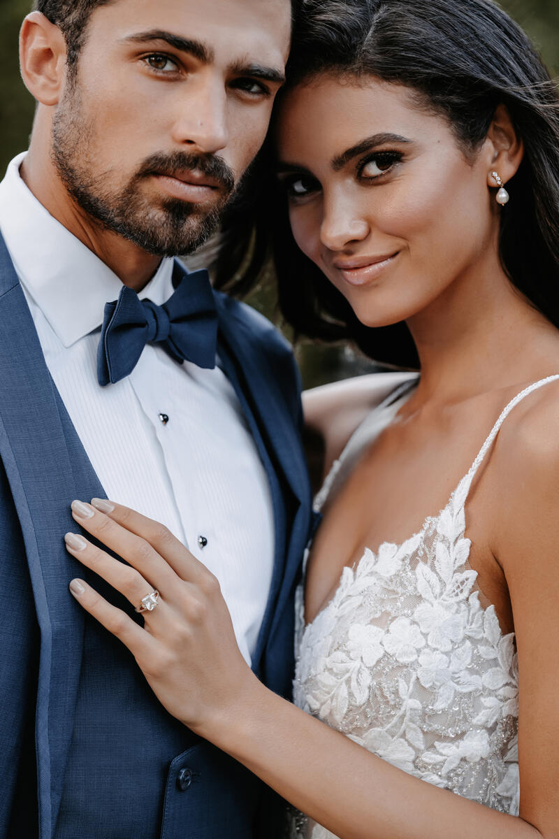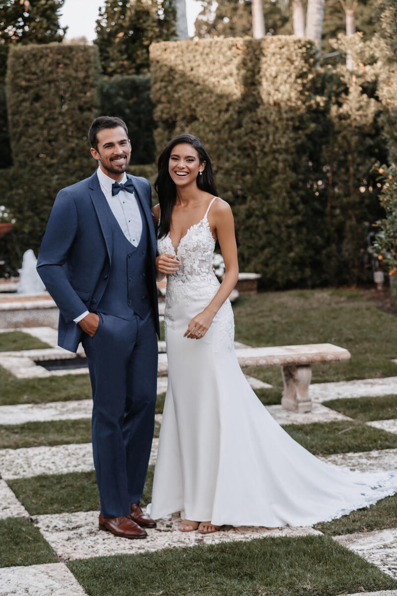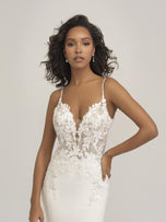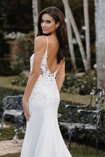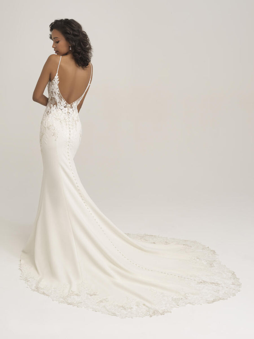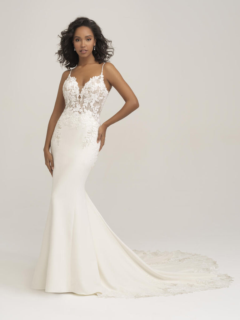 A gorgeous sheath wedding gown fit for your destination wedding or informal beach ceremony, we're loving style 3450 from Allure Bridal's Fall 2021 affordable Romance Wedding Dress collection. Beaded lace appliques softly trail down the bodice of this crepe sheath gown, a chic style with an illusion plunging neckline and low open back. Also available lined as style 3450L for a more modest bridal gown look. Please call our Dallas, Texas location to check in-store availability, pricing and current ship dates.