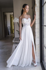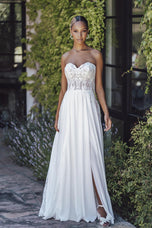 This romantic bridal gown from Allure Bridals' affordable Romance collection for Spring 2023, is style R360. Perfect for your outdoor beach destination wedding, she features a strapless sweetheart illusion bodice with an a-line skirt. The beautiful lace inset train adds a romantic touch to this stunning look, featured with a sexy slit. Consider ordering with a lined bodice for a more modest bridal gown feel.