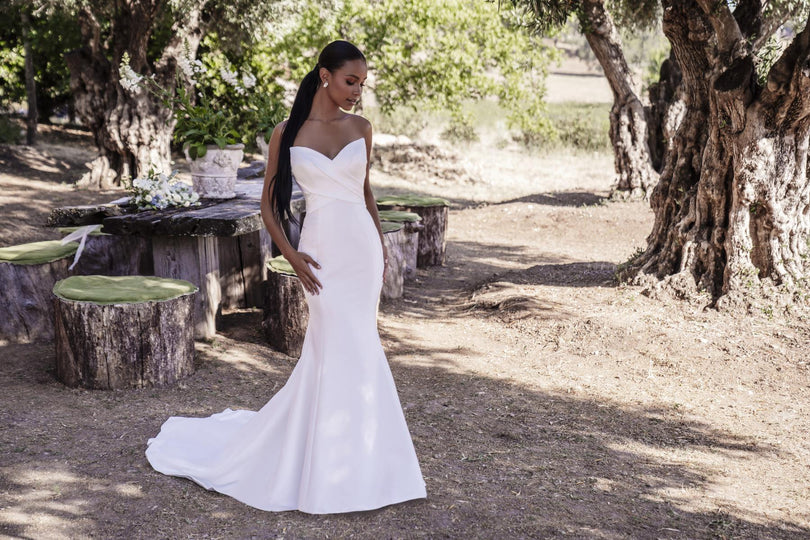 This gorgeous Romance Collection by Allure Bridal gown for Spring 2023 is perfect for the bride who believes less is more. The R3608 sheath mikado style is classic and timeless with a sweetheart neckline for a touch of romance. The strapless style creates a simple, yet sweet look perfect for a destination beach wedding ceremony or romantic reception under the stars. Consider adding her detachable train (sold separately) for added drama. Please call our Dallas, Texas location to check in store availability, pricing, and current ship dates.