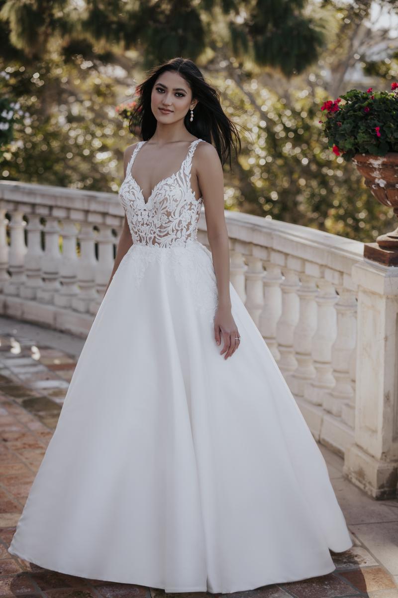 Style R3652 is a princess-inspired addition to the Fall 2023 Allure Romance Bridal Gown collection. A keyhole back accents this romantic ballgown's sequin-appliqued bodice, paired with a gorgeous full skirt. A perfect pick for your formal wedding or Disney-inspired affair, she's both dramatic and classic. Designed with an illusion bodice, she's also available lined in the front for a more modest bridal gown. Please call our Dallas, Texas location to check in-store availability, pricing and current ship dates.