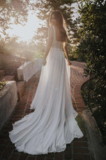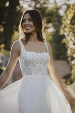An elegant take on modern styling, this fun and flirty bridal gown is style R3655 from the Fall 2023 Allure Romance Bridal Gown collection. Featuring a squared neckline and beaded lace appliques, this Chantilly lace and chiffon gown is pure magic and ready to float down the aisle at your beach wedding or destinations setting. Designed with an illusion bodice beneath delicate lace appliqus, she's also available fully lined far more modest bridal gown look. Please call or Dallas, Texas location to check in-store availability, pricing, and current ship dates.