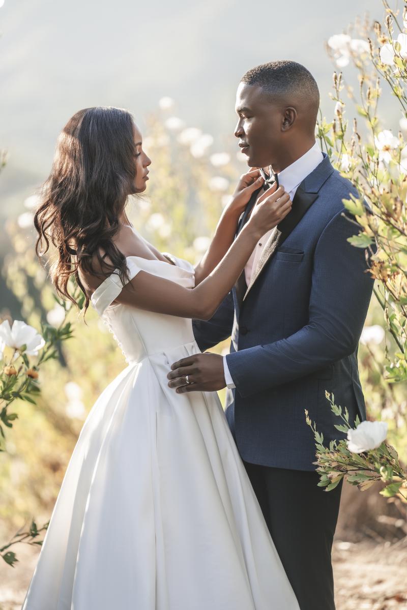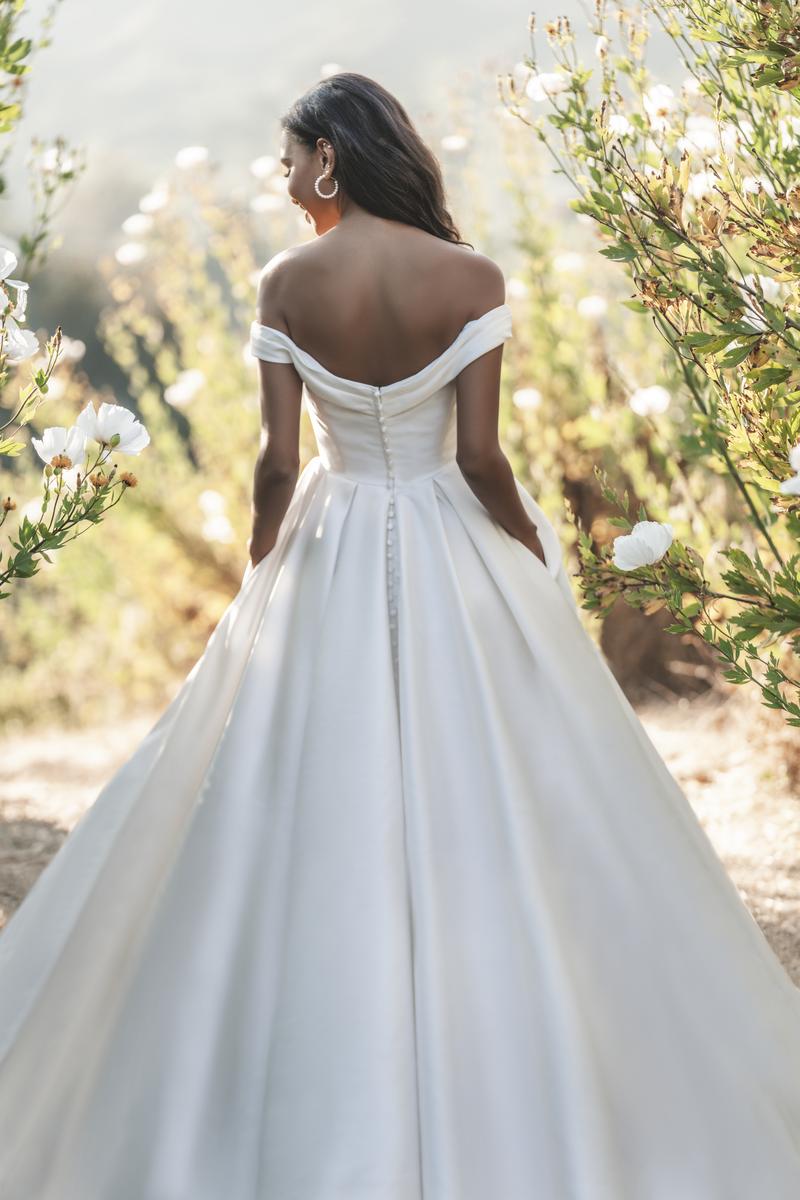A subtle cowl effect softens the elegant off-shoulder bodice of this Mikado bridal ballgown.