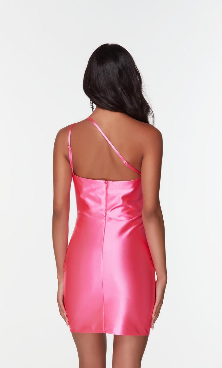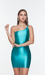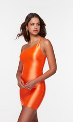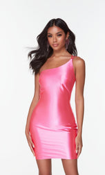 This short stretch satin homecoming dress is absolutely captivating! 4520, is from fall 2022 Collection by Alyce Paris and is created in rich stretch satin fabric that will show off your figure. The gown is designed with a modest one-shoulder neckline with double straps that cross along the open back. This is perfect for any school dance!