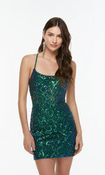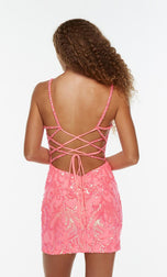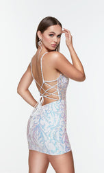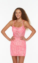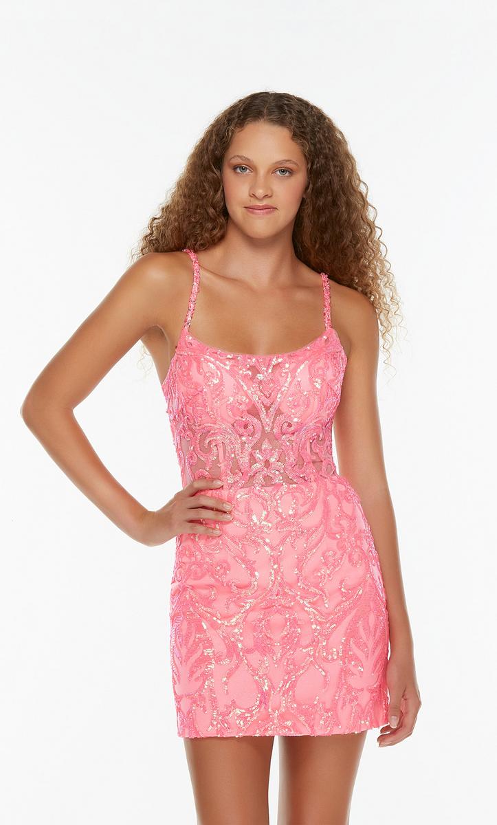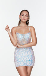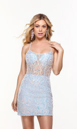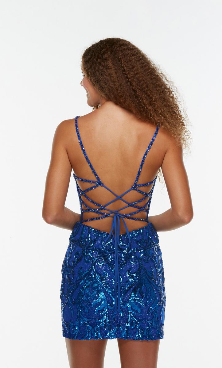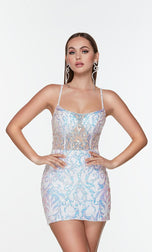 This Alyce Paris cocktail dress is so dreamy! 4534, is from Fall Collection that will have you up to date on new trends! This is perfect for homecoming and showcases a sheer corset, fitted bodice with beaded lace appliques. The scoop neckline has straps for support and create an eye-catching lace-up. The fitted skirt is completed with matching sequin detail.