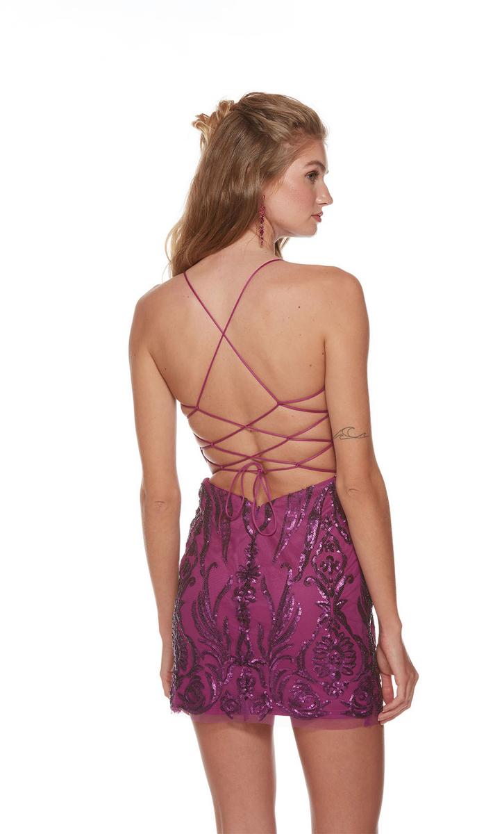 Sequin formal dresses are still one of the hottest homecoming trends of 2023! 4668, is one of them! This Alyce Paris cocktail showcases a plunged neckline, thin straps that create a lace-up on the open back, and sparkly floral sequin detail. For additional details on color options and sizing, give us a call at Terry Costa.