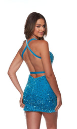 Slay the night in this stylish short Homecoming dress by Alyce Paris. 4747, showcases a plunged sweetheart neckline, thick straps that create a halter top and crisscross on the open back. Fully adorned with gleaming sequins, this body con dress will have all eyes on you!