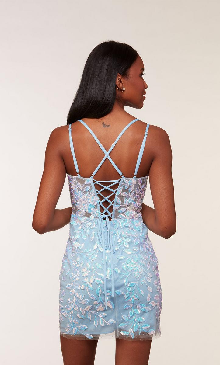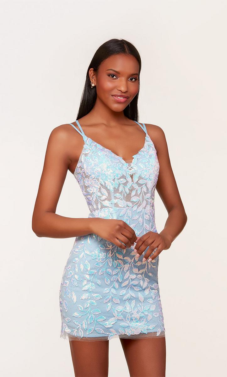 4763, will have you read carpet ready! This Alyce Paris cocktail dress is the perfect attire for any school formal to a girls night out and much more! The plunged neckline has thin double straps for extra support, a crisscross and lace-up back for a snug fit, and lovely leaf patterns adorned with iridescent sequins. This is appropriate for any school formal!