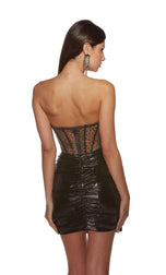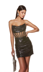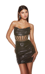 Dare to captivate in Alyce Paris's Homecoming 2024 creation, where allure meets modern chic. Crafted from metallic jersey fabric, this short dress boasts a tantalizing u-neckline, drawing the eye with its mysterious allure. A daring, see-through corset detail enhances the silhouette, exuding a hint of sensuality. Strapless and sleek, it hugs curves with grace, offering a contemporary edge to classic elegance. Perfect for those who embrace the spotlight effortlessly, this dress whispers sophistication without uttering a word. Whether it's a glamorous gala or an intimate soire, this piece promises to make every moment as memorable as the night itself.