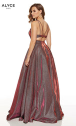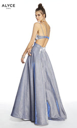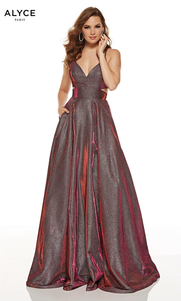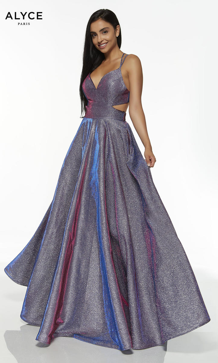 Sparkle the Night away in this Ballgown by Alyce Paris. 60567,features spaghetti straps to support the low V-neckline that leads into side cutouts that will flatter your waist and the exposed back. This A-line long dress is made of cracked iced taffeta, and finished off the full-length skirt is POCKETS!. Shine the night away on Prom Night in this glamorous gown!