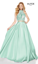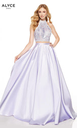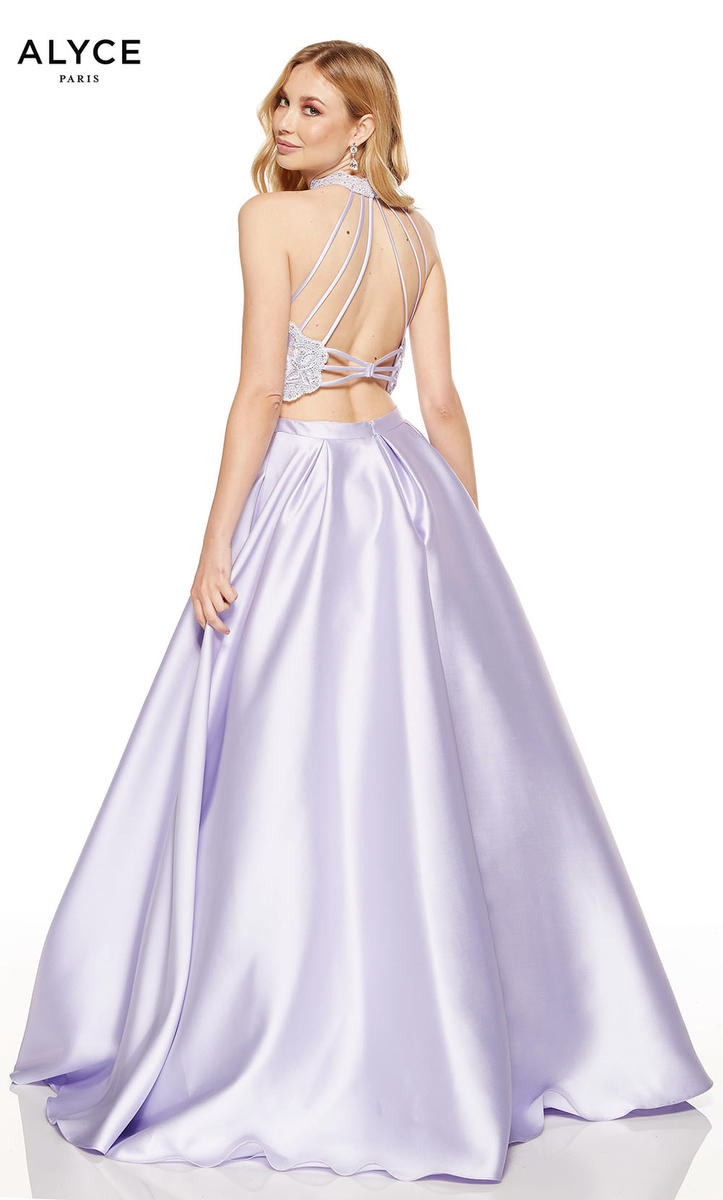 Dance The Night Away In This Gorgeous 2-Piece Alyce Paris Prom Dress Featuring A Lace Halter Neck Bodice With A Flattering Open Back With Straps And A Floor Length Ballgown Skirt With A Waist Accenting Waist Band. Perfect As A Prom Dress, Homecoming Dress, Or Pageant Dress And Comes In Colors Light Purple And Light Blue.