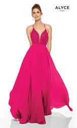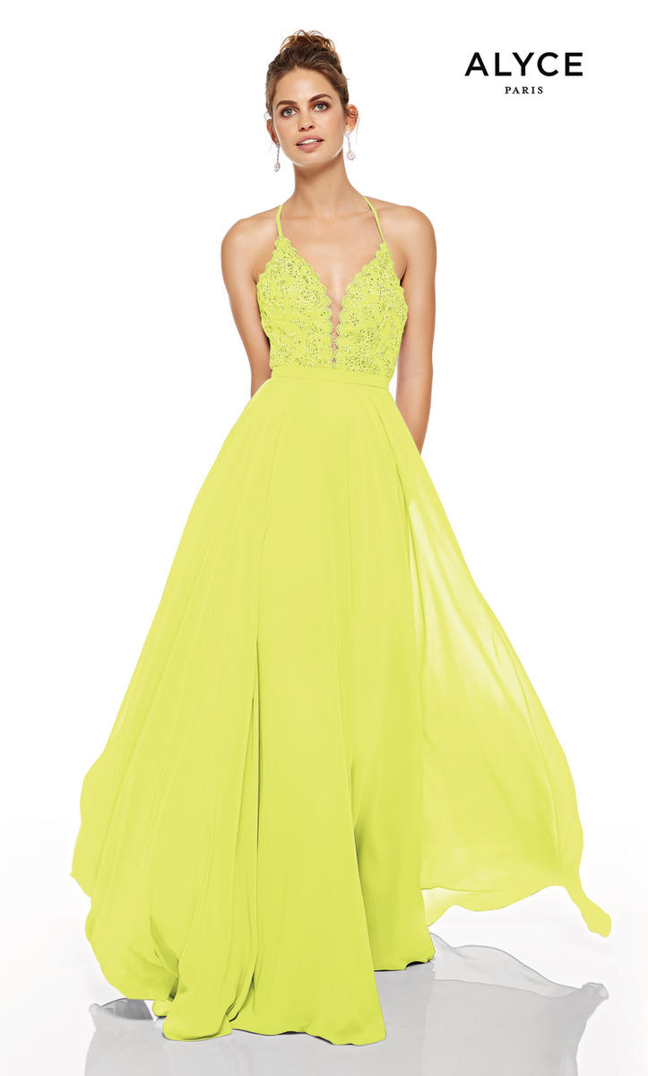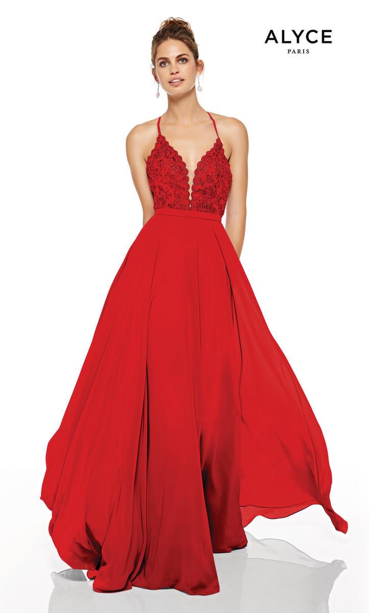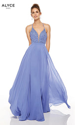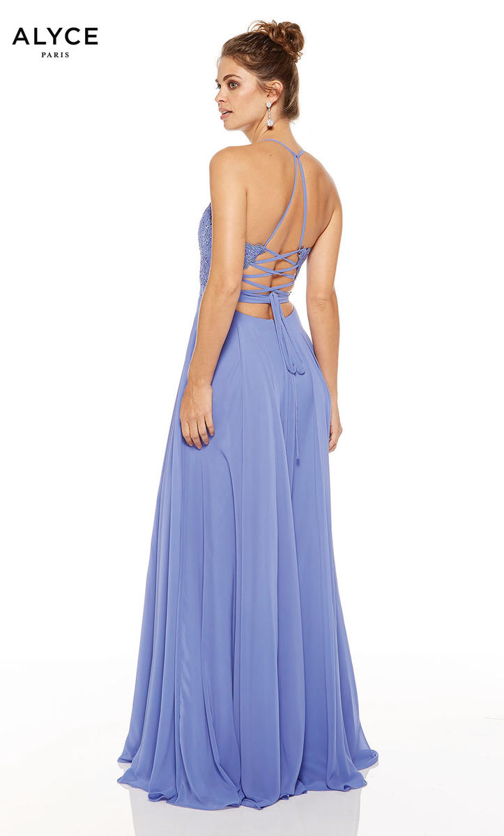 Rock this stunning gown by Alyce Paris,60637. This beautiful gown is made of chiffon material. The gown features a deep v neckline with thin straps leading into an open back with a corset lace up to accentuate your waist leading down to a long a line flowy skirt.