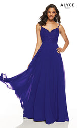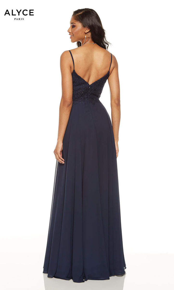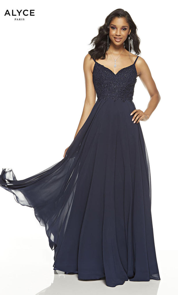 this simple gown by Alyce Paris,60638, features thin straps that follow down to a subtle v neckline cut, a lace bodice that is adorned with beads to add a touch of glamor. Continuing down to a fashionable a line flowy skirt that'll be sure to flow beautifully at the dance floor for your special event.Look beautiful on the night of your special event!
