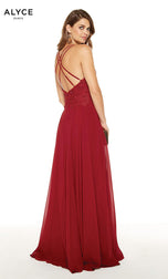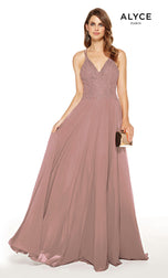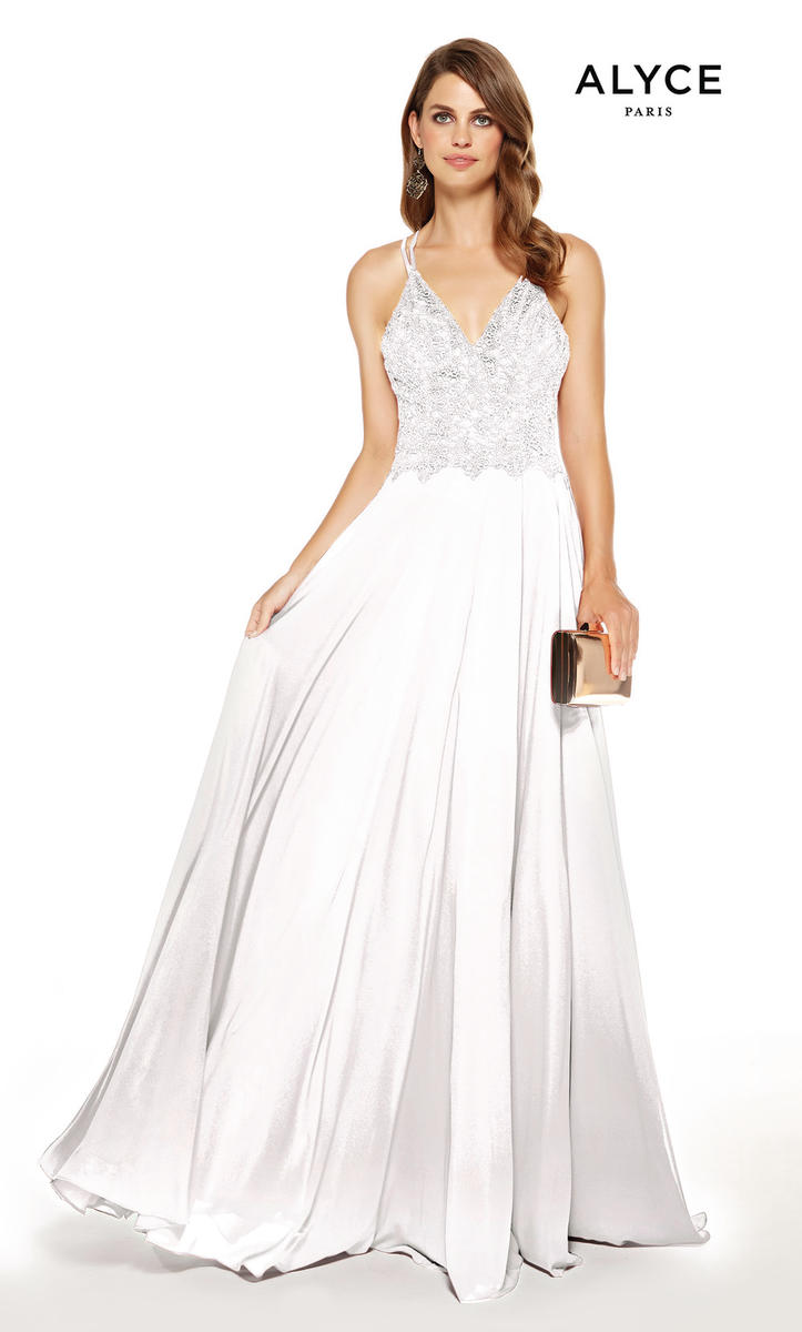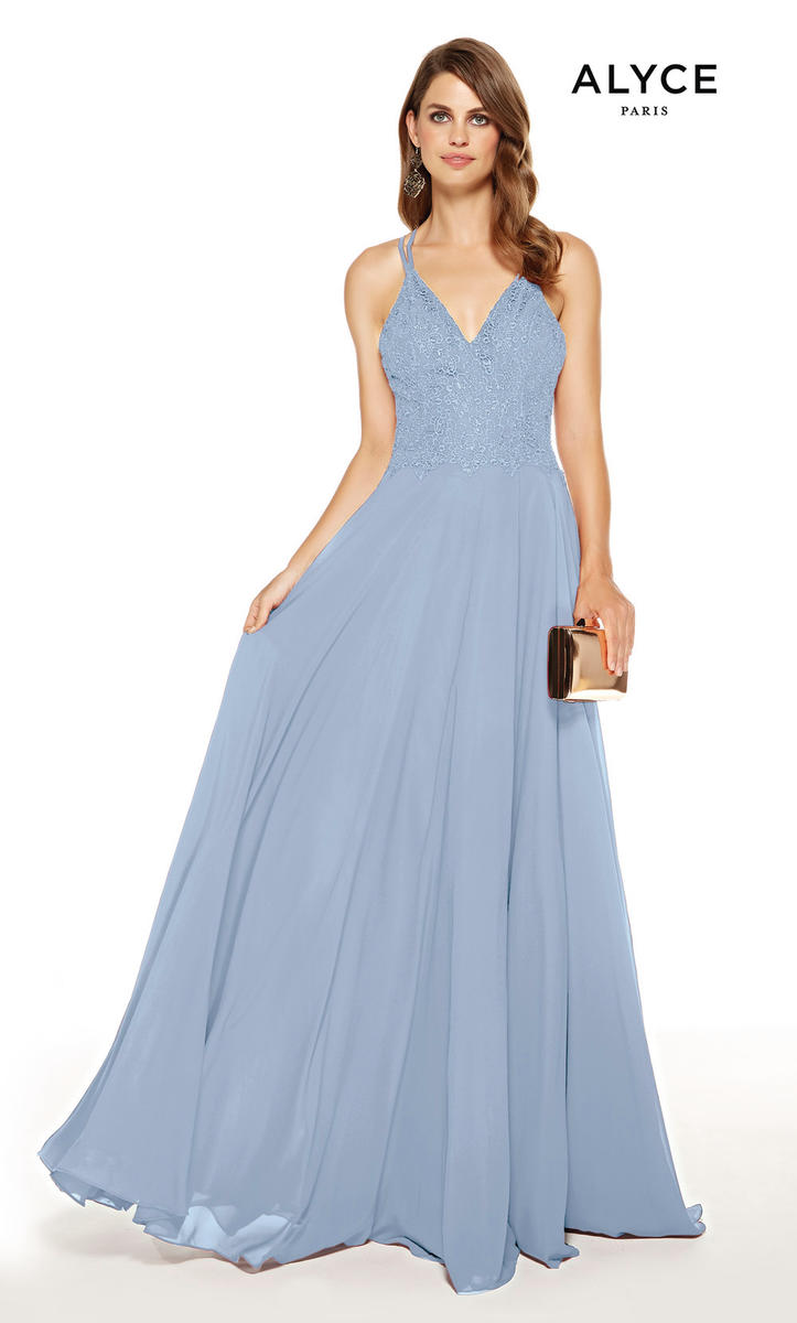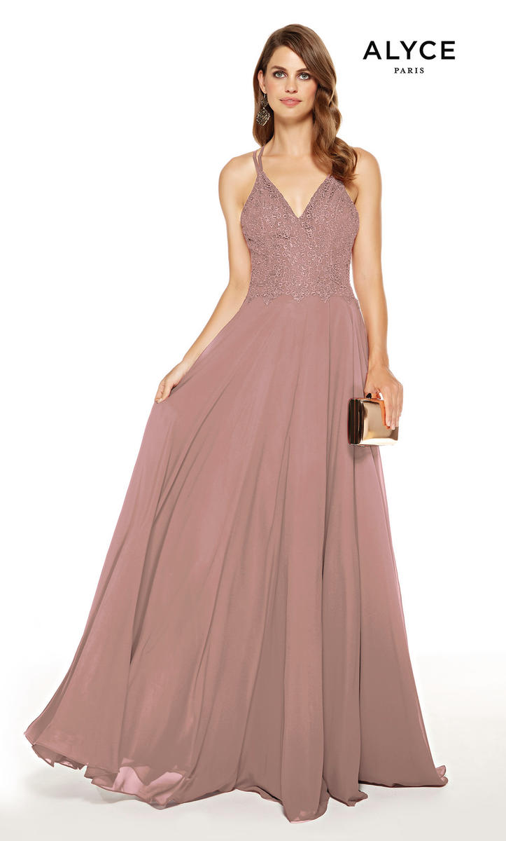 This Alyce prom gown features a lace bodice with a V-neckline, edged with double spaghetti straps that make up the crisscross back. 60639,features a flowing chiffon skirt to complete this A-line formal dress. Look glamorous Prom night in this gown!