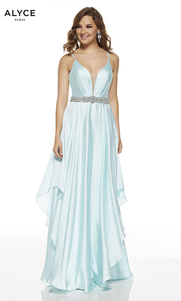 The simplicity of the gown will definitely turn heads at your event! This Alyce Paris formal gown,60641,features a gorgeously ruched bodice with a mesh insert plunging neckline, spaghetti straps and lace-up back. A beaded belt that accents the flounced chiffon Aline skirt