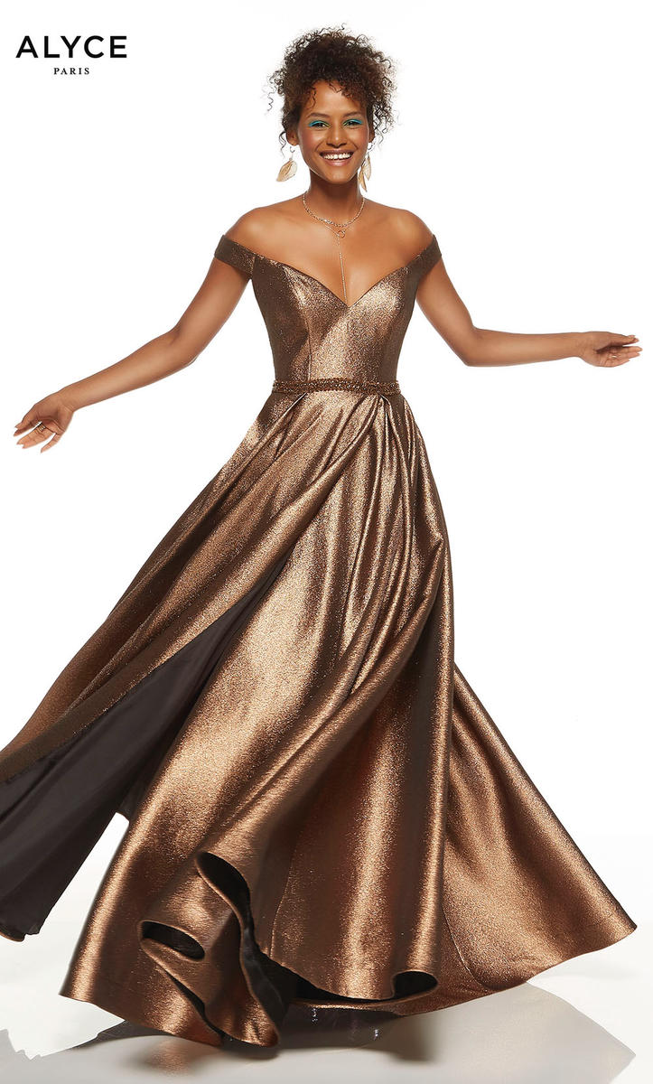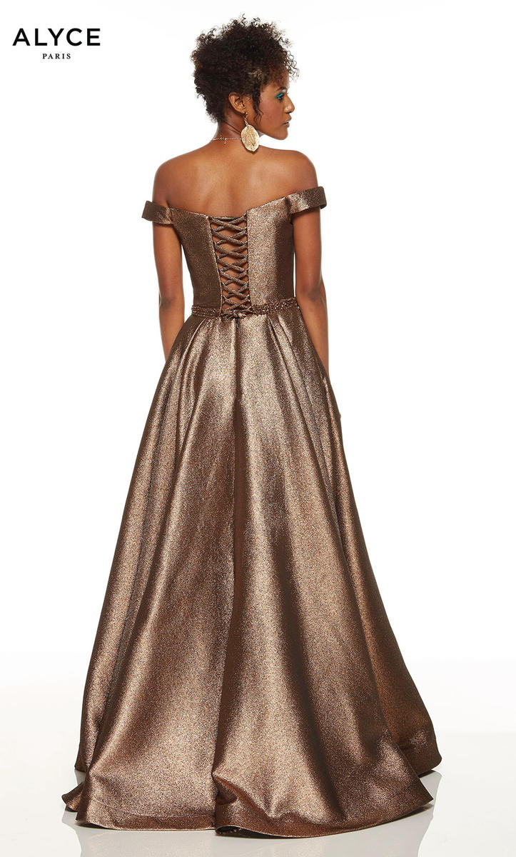 Shine bright on that dance floor in this fully glitter Alyce Paris ballgown. 60723, showcases off the shoulder sweetheart neckline with dainty cap sleeves and a slim fitting bodice with a beaded belt that leads into the lace-up back for easier adjustment with a full Aline skirt.The fabric in this Alyce Paris Prom style is Metallic Jacquard