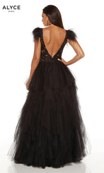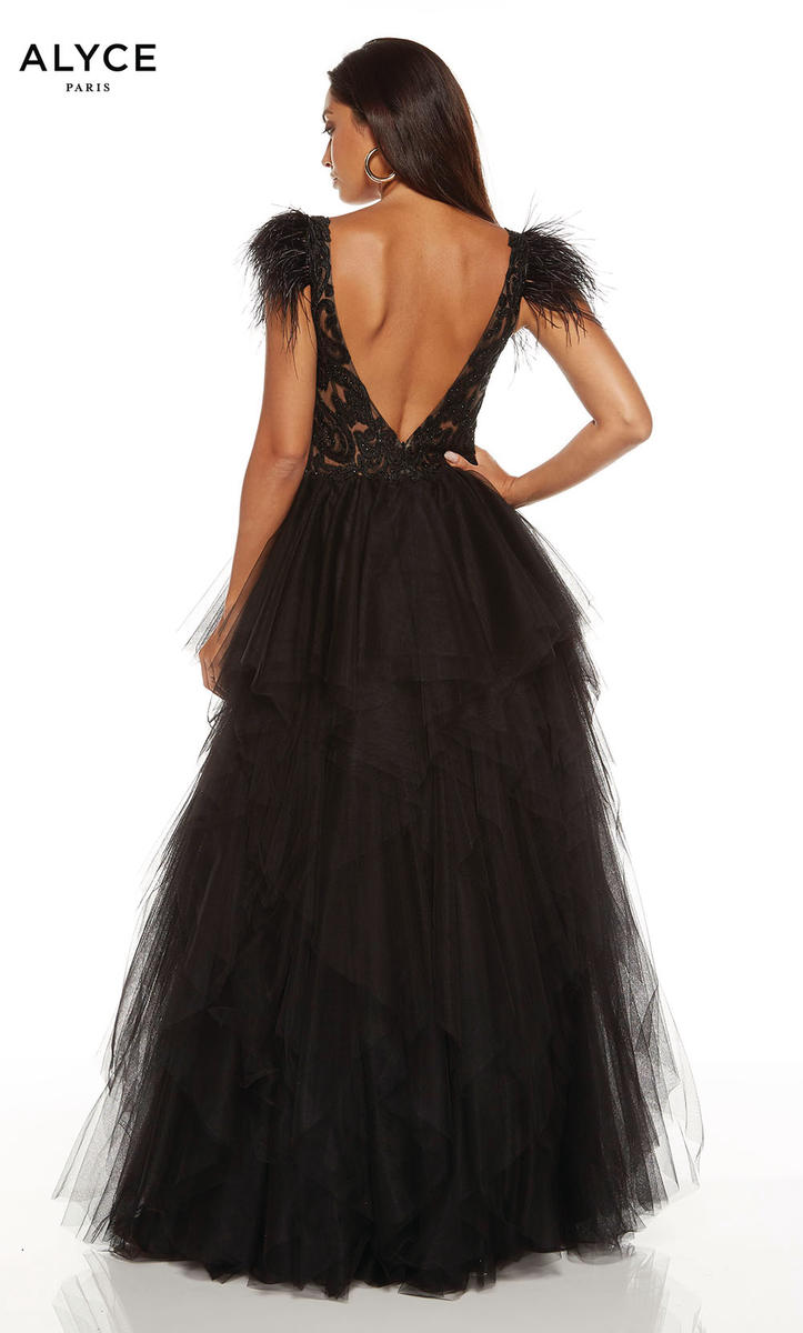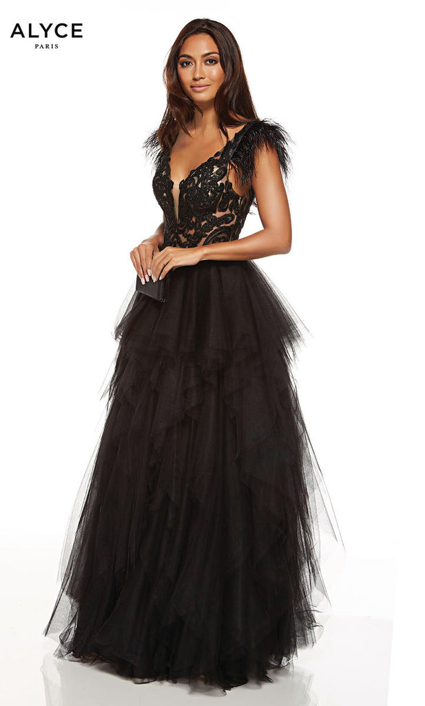 Be unique in this glamorous gown by Alyce Paris,60737. The elegant gown features a plunging neckline with straps that are adorned with cap feathers that leads into a sheer embroidered bodice. giving it the finish touch is the full layered ruffled skirt.