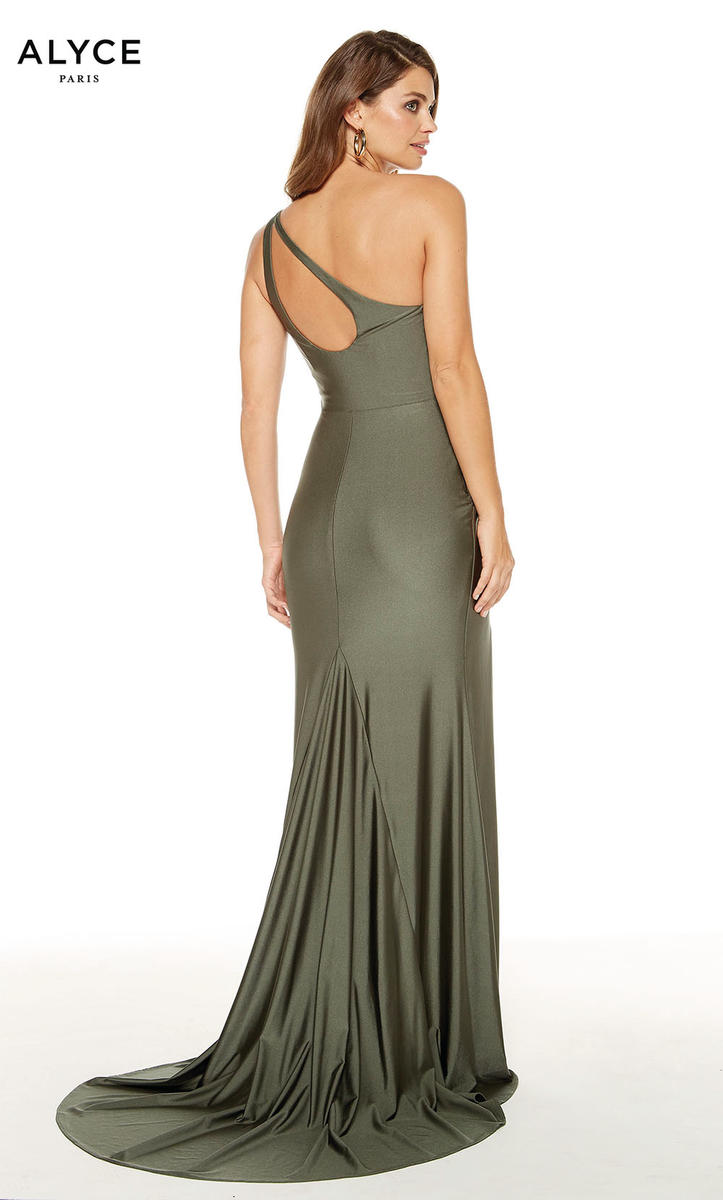 Make a fashion statement by wearing this glamorous long evening gown by Alyce Paris. This one shoulder gonw features a rouching effect at the waistline to accentuate your curves. 60768, gives a sexy thigh high leg slit. Finishing touch of a unique key hole opening on the back.Sure to make a statement on you prom night.