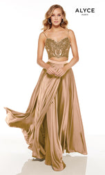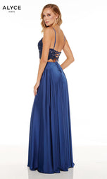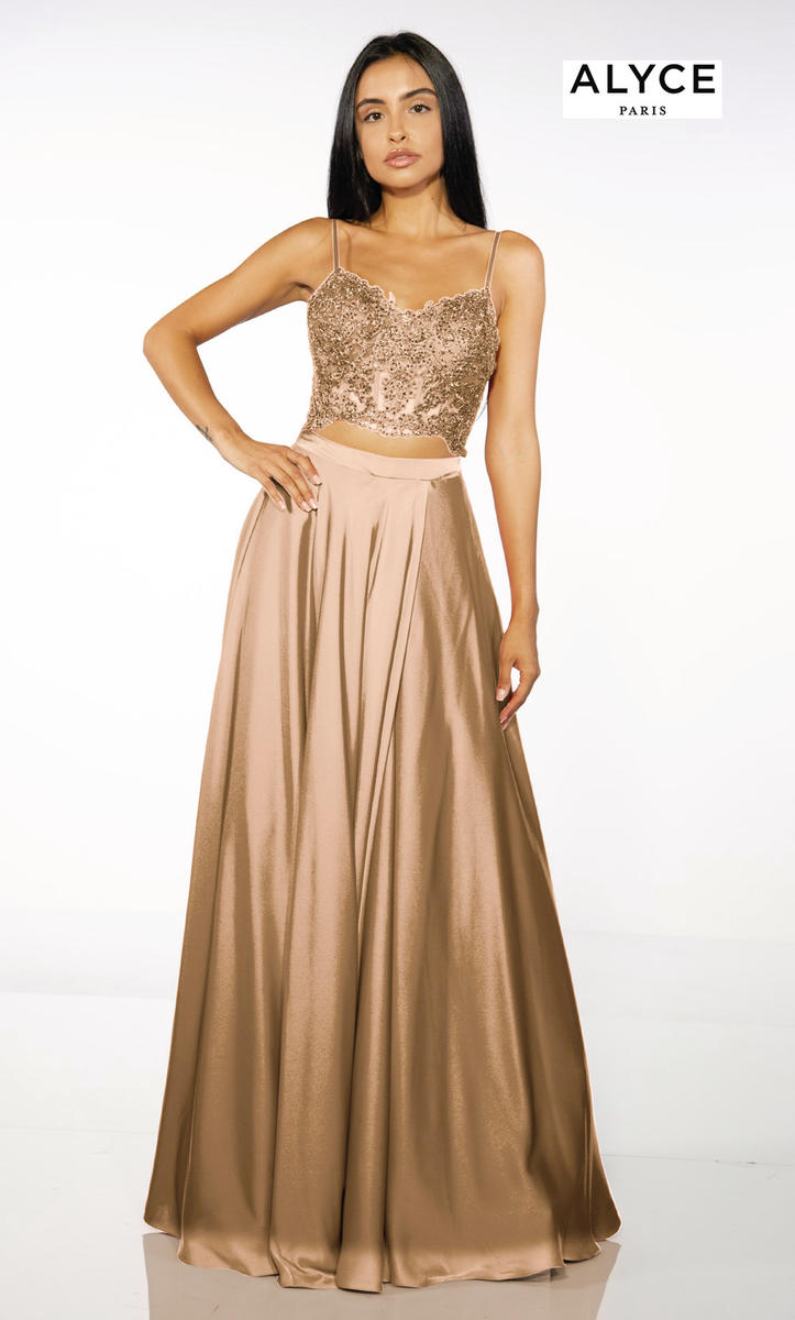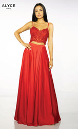 Make a fashion statement with this long two-piece,60777. This long Alyce Paris,features a fully laced top with a semi sweetheart neckline with straps.Along with lace-up back for adjustment. Lastly, a satin skirt with a fitted band at the waistline to accentuate your curves and a high slit.Perfect for Prom or any special occasion.