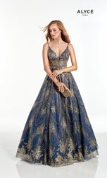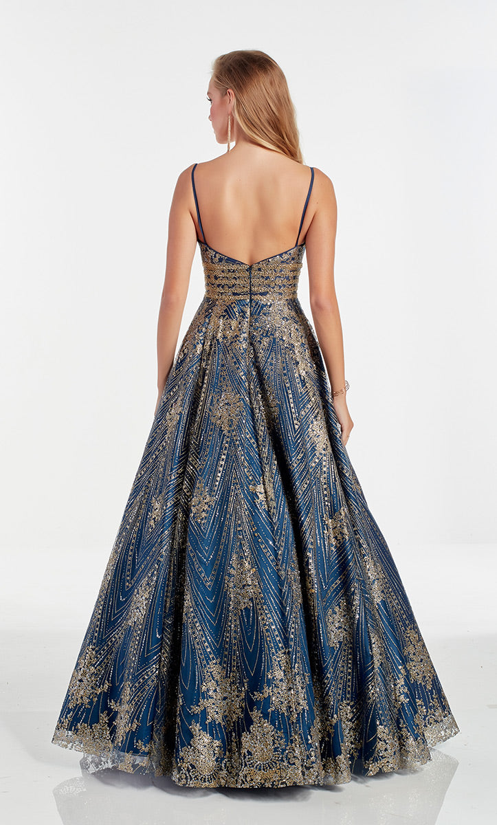 Embrace your uniqueness in this marvelous long evening gown designed by Alyce Paris. 60870, showcases a deep v-neckline with modesty insert, thin straps that form into an enclosed zipper back. A fitted bodice that is adorned with beautiful multi horizontal straps that wrap around defining your waistline and adding a bit of sparkle. Finished off with a glitter tulle full skirt with contrasting details, making it stand out from the others and sweep train that will sway with every step that you take! Making the perfect A-line gown to showcase at Prom, Formal or Black-tie!