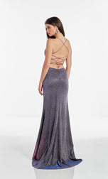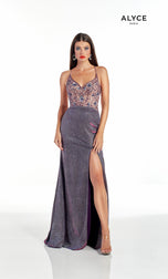 Show your slim figure off in this stunning fitted long evening gown designed by Alyce Paris. 60873, features a v-neckline with thin straps that form into a breathtaking lace-up open back! A fitting bodice that is adorned in with floral and beaded swirls ! The gown is completed with a glittery chrome skirt and a thigh high leg slit ! Perfect attire for any Black-tie, Formal occasion or School Dance !