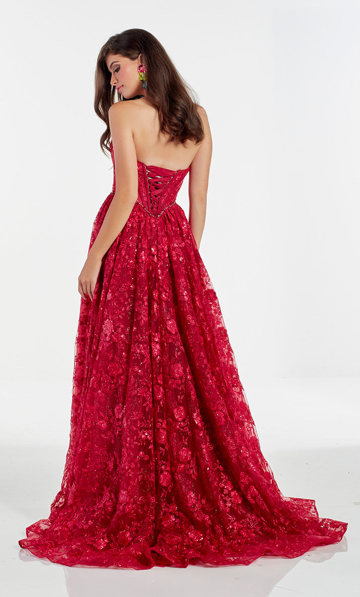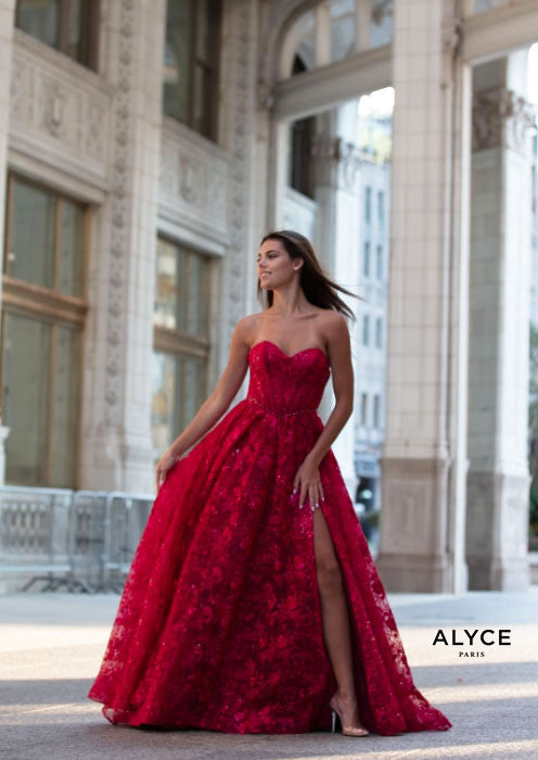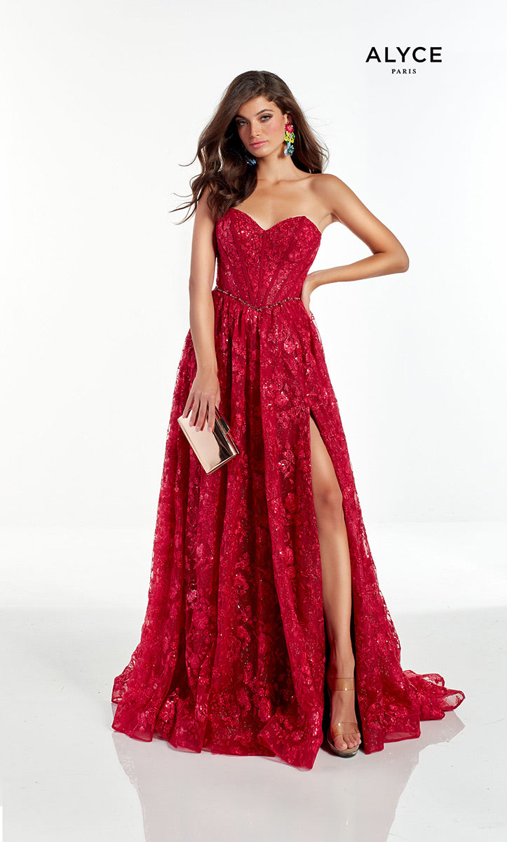 Make this striking laced Aline designed by Alyce Paris your attire to that special occasion ! 60881, showcases a strapless sweetheart neckline with an adjustable corset back ! A fitting bodice that is fully adorned in beautiful lace and exposed boning. Completed with a trim of beading at the waist and cascading to the full lace skirt ! Sure to feel and look like a million bucks ! This gown is perfect for Prom, winter formal or any Black-tie .