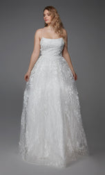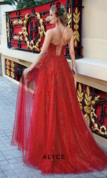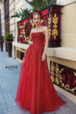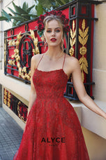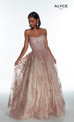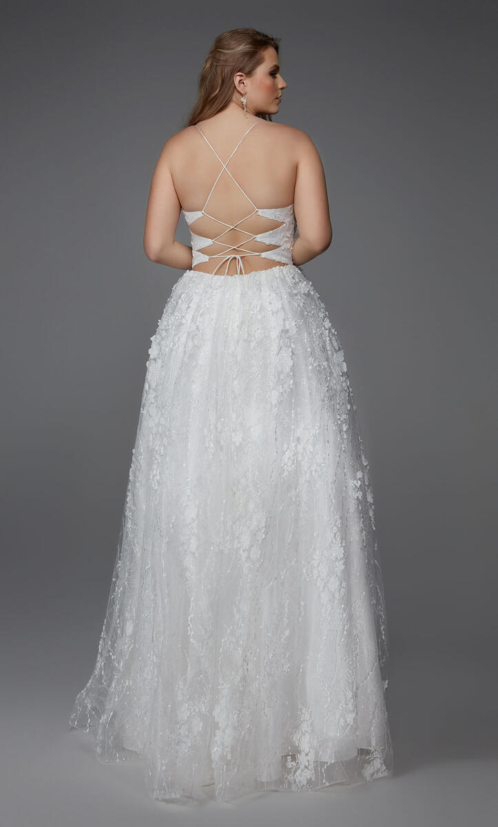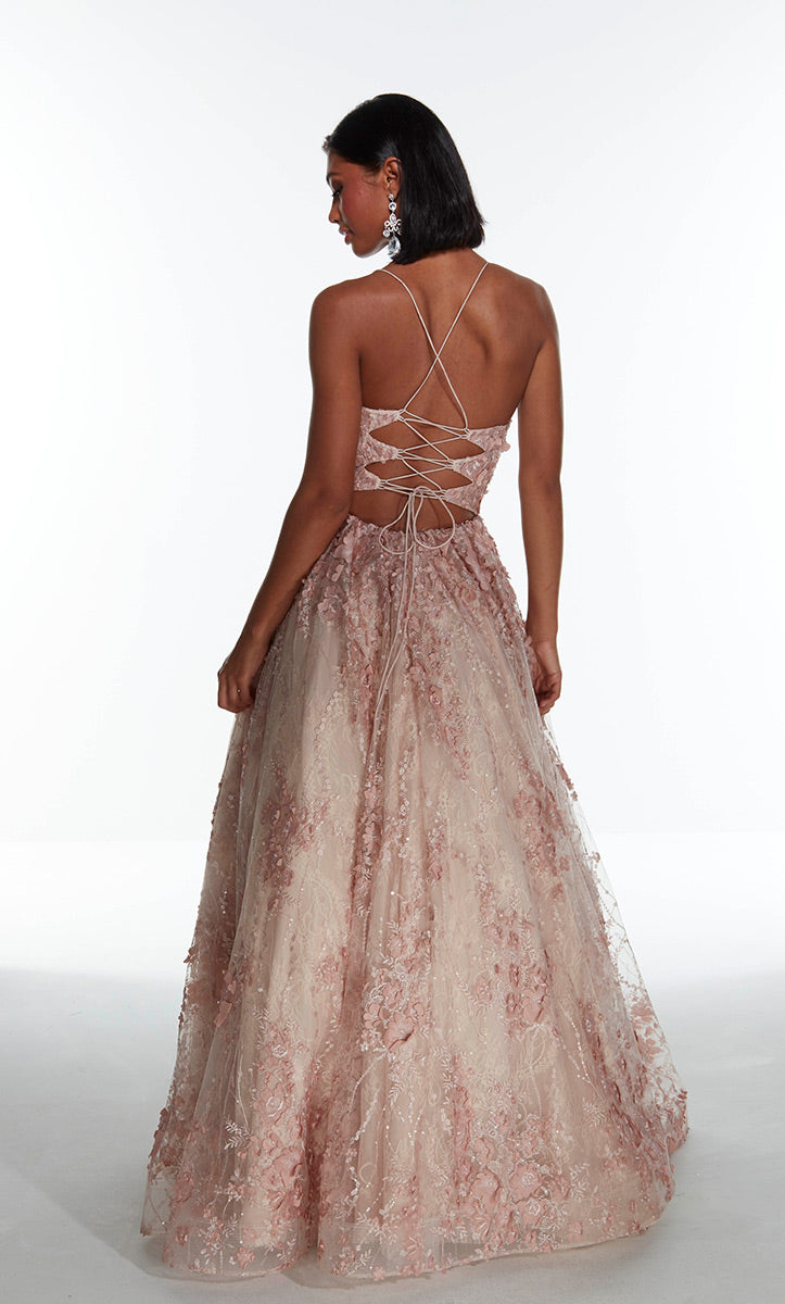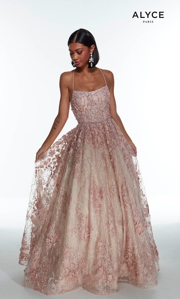 This vintage chic ball gown dress 60883 by Alyce Paris is a gorgeous choice for your social event. The scoop neckline on this dress features thin straps that turn into an adjustable lace up back. The bodice is adorn in 3D floral appliques that give it that unique look. The lace skirt flows from the waistline adorning those matching floral appliques. Perfect attire for Hoco Court, Prom or Gala !