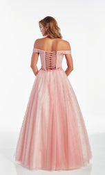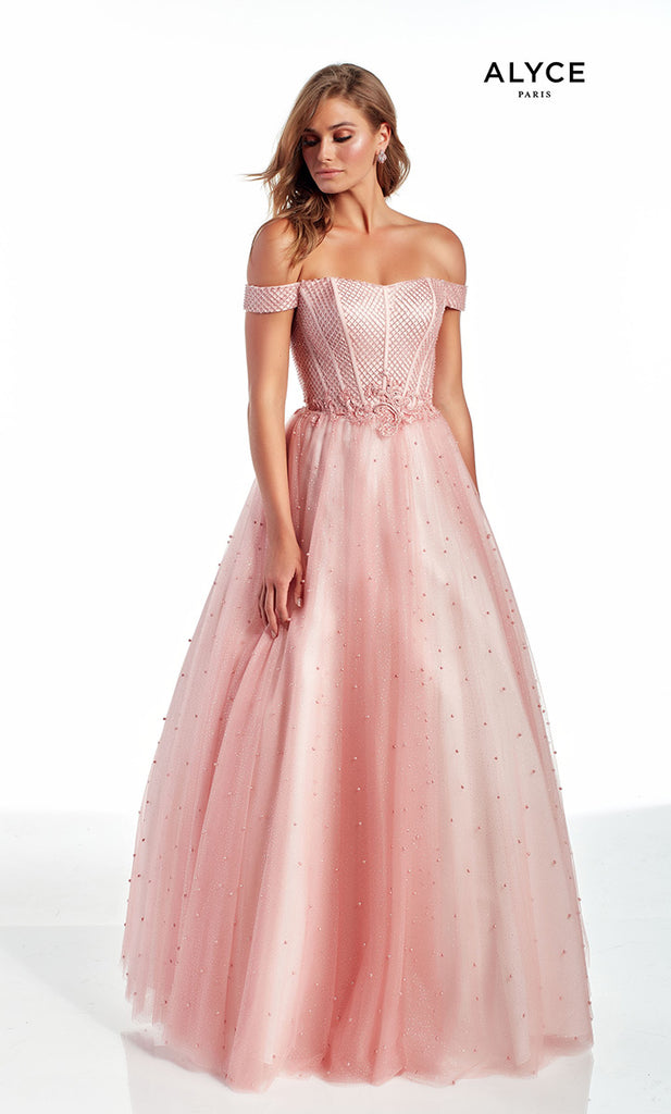 Lovely and classy is this beautiful A-line gown designed by Alyce Paris. 60899, showcases an off-the shoulder cap sleeves, a unique structured corset that forms into an adjustable lace-up back. A touch of applique with beading at the waist. The Aline gown is completed with a full layered tulle skirt with pearls for extra sparkle! Making it the perfect gown for any School Dance.