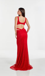 Glam style 60981 by Alyce Paris will have you feeling like you just stepped off the red carpet. This v neckline dress is made from a gorgeous ton on tone glitter net material. The dress showcases cut out sides and a key hole opening in the back. The fitted skirt falls to the ground with an unique sheer illusion slit! Showcase this to Senior Prom or Hoco!