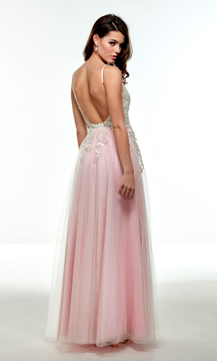 Have a special occasion to attend? This long glitter aline gown is the one for you! This style, 61019, is designed by Alyce Paris and showcases a v-neckline with thin straps and low v-back. The fitted top is adorned in stunning floral applies that cascade to the flowy tull skirt! A front leg slit and sweep train completes this gown.