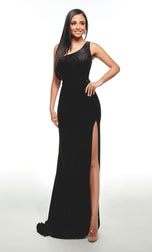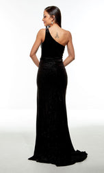 A classy and romantic look in this beautiful long formal gown designed by Alyce Paris. 61033, features a unique one shoulder neckline that leads into an enclosed zipper back. The fitted silhouette will definitely flatter your figure! The velvet made gown is perfect for any Fall/Winter formal occasion and is finished off with a side thigh-high leg slit! Perfect for any Formal occasion you may have coming up!