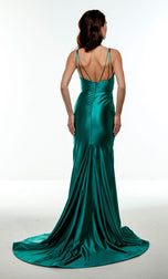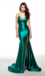 Be the talk of the night in this figure flattering formal gown designed by Alyce Paris. 61059, showcases a v neckline with ruching, thin straps that form into a doubled enclosed zipper back. The stretch satin fabric with hug your figure just right! Finishing touches of a thigh-high side leg slit and sweep train with horsehair hem for volume! This gown is perfect attire for any Fall Formal!