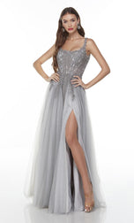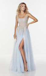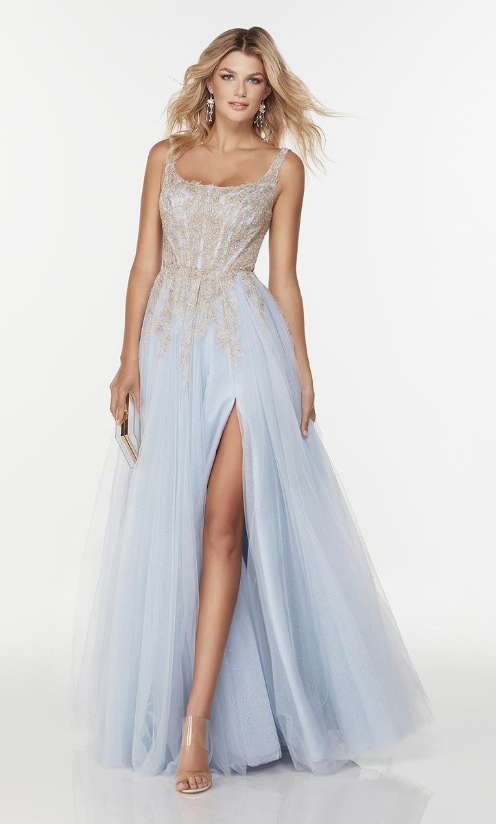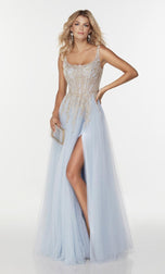 Perfect for all ages and body sizes! This gorgeous long Aline gown from the Alyce Paris April line, 61071, showcases a a scoop neckline, sheer thin straps and fitted laced bodice. A flowy tulle skirt that will sway with every step that you take! A sexy front leg slit completes this look! Check it out at our store.