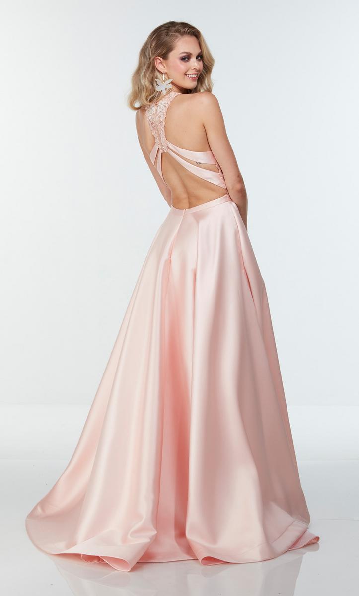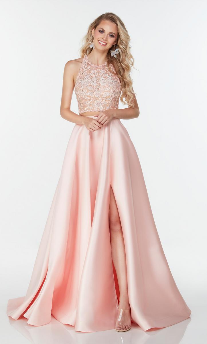 Looking for a modest yet cute formal gown? This long aline two-piece by Alyce Paris is the perfect one for you! 61081, showcases a modest halter neckline with thick straps that form into an eye-catching keyhole back! The fitted top is fully embellished in delicate lace. The full mikado skirt that will flounce with every step that you take!