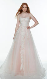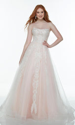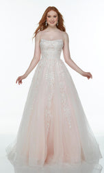 Keeping it simple yet classy in this long aline gown designed from Alyce Paris Prom. 61084, showcases a modest straight across neckline, spaghetti straps and lace-up back. The entire gown has a unique lace detailing that falls onto the glitter. So go all out on Prom night!