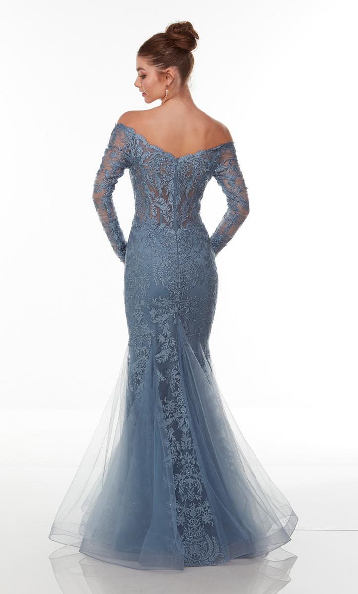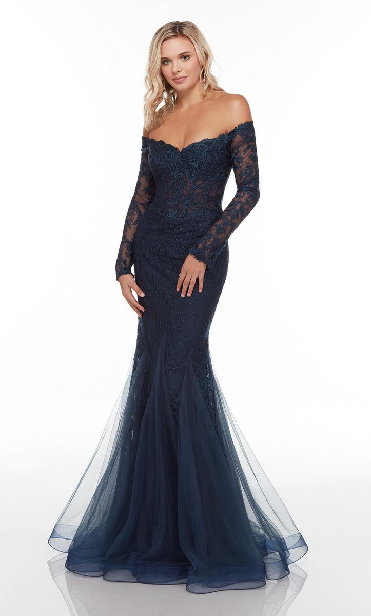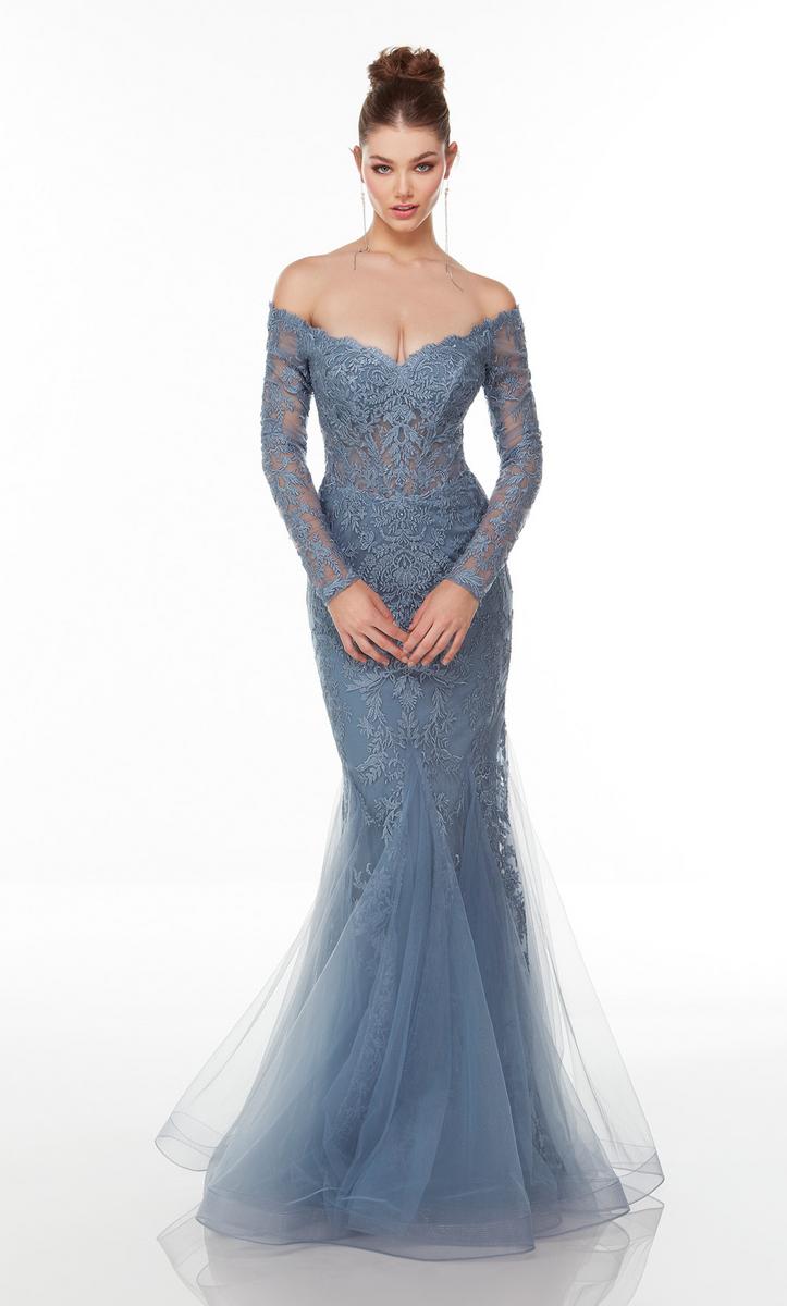 A figure flattering and classy gown from Alyce Paris, 61097. The gown features a lovely off-the-shoulder neckline with long laced sleeves. The fitted top is an exposed corset adorned with delicate lace applies that run down the fit and flare gown! Perfect for all ages and sizes! Come try it on at Terry Costa.