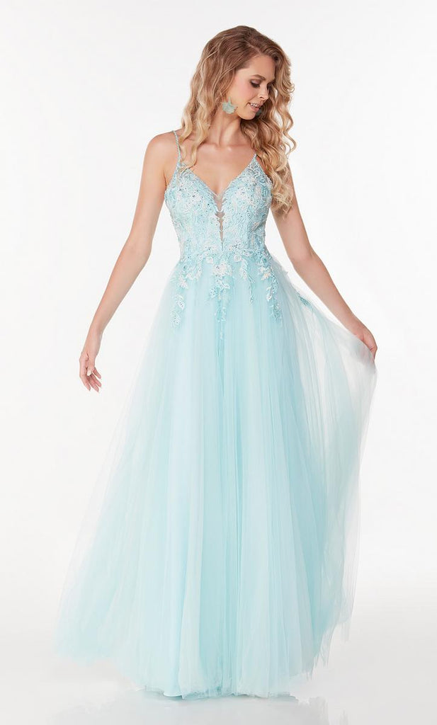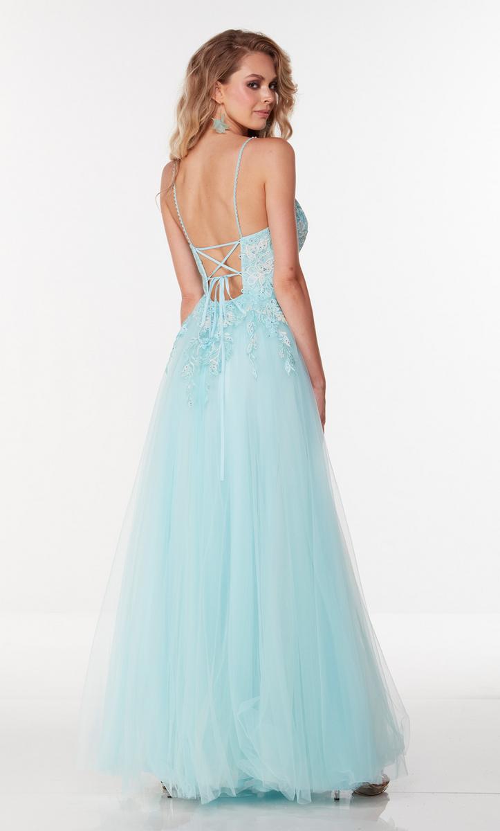A elegant gown designed by Alyce Paris,61102, showcases a v neckline with thin straps and laceup back. The fitted top wish fully adorned with delicate lace appliqus that cascade onto the flowy tulle skirt. Perfect for any school dance!