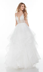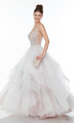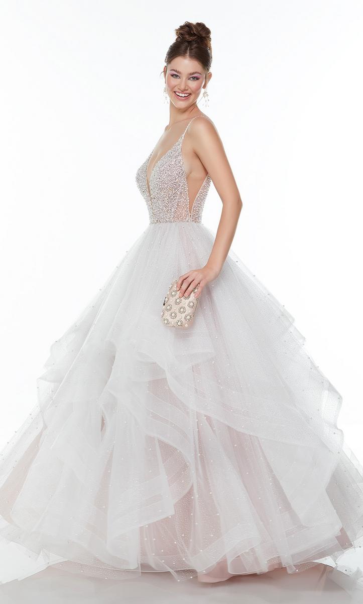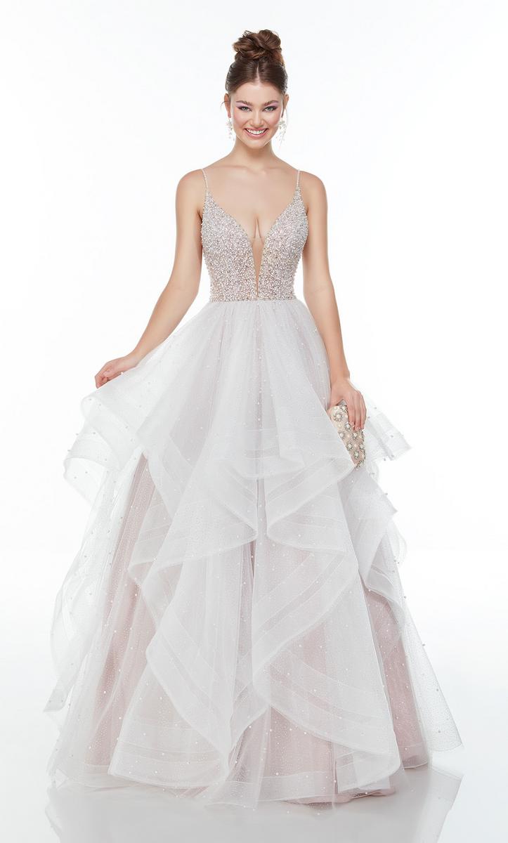 Show off your inner fashionista in this stunning long Aline gown designed by Alyce Paris. 61107, showcases a plunging v neckline with mesh insert. Straps that form into a low scoop back. The sheer bodice is adorned with dazzling beading. A unique tulle skirt adorned into layered ruffles with horsehair hem!