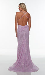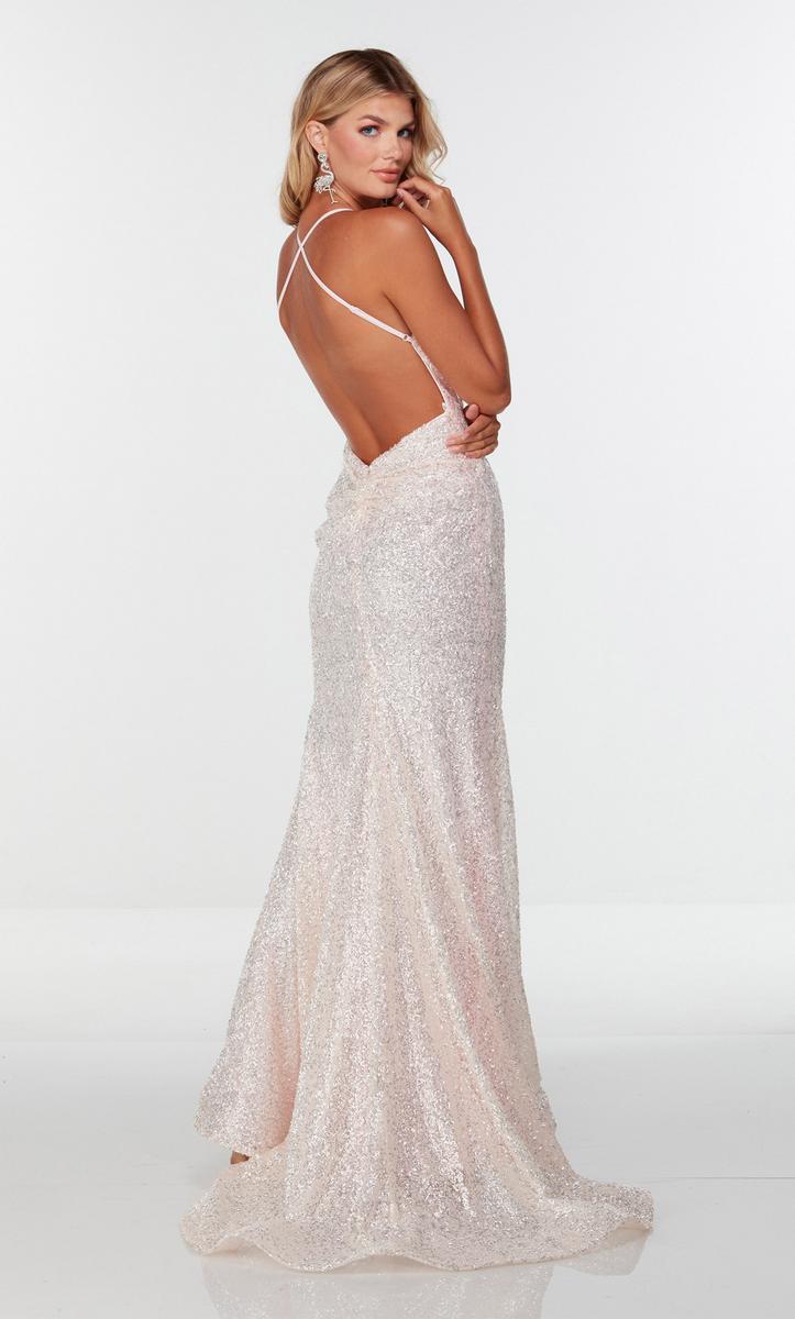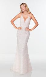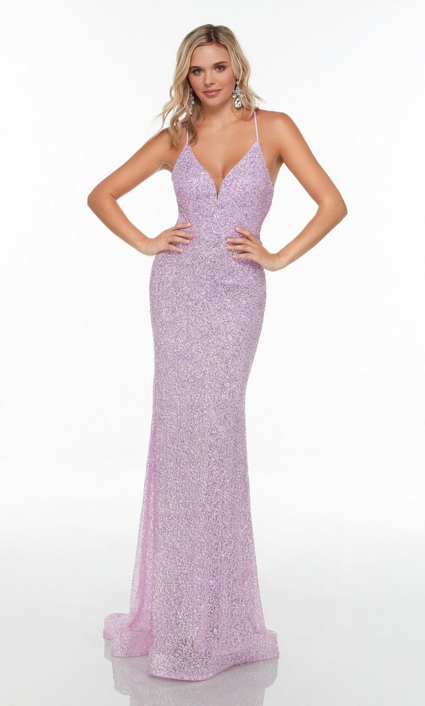 This fully sequined fitted gown is made in lovely color tones that would be perfect for a Spring occasions! 61117, is from the Alyce Paris 2022 Prom line and showcases a sexy plunging v neckline with thin adjustable straps that form into an open crisscross back. The sweep train and hemline are completed with horsehair hem!