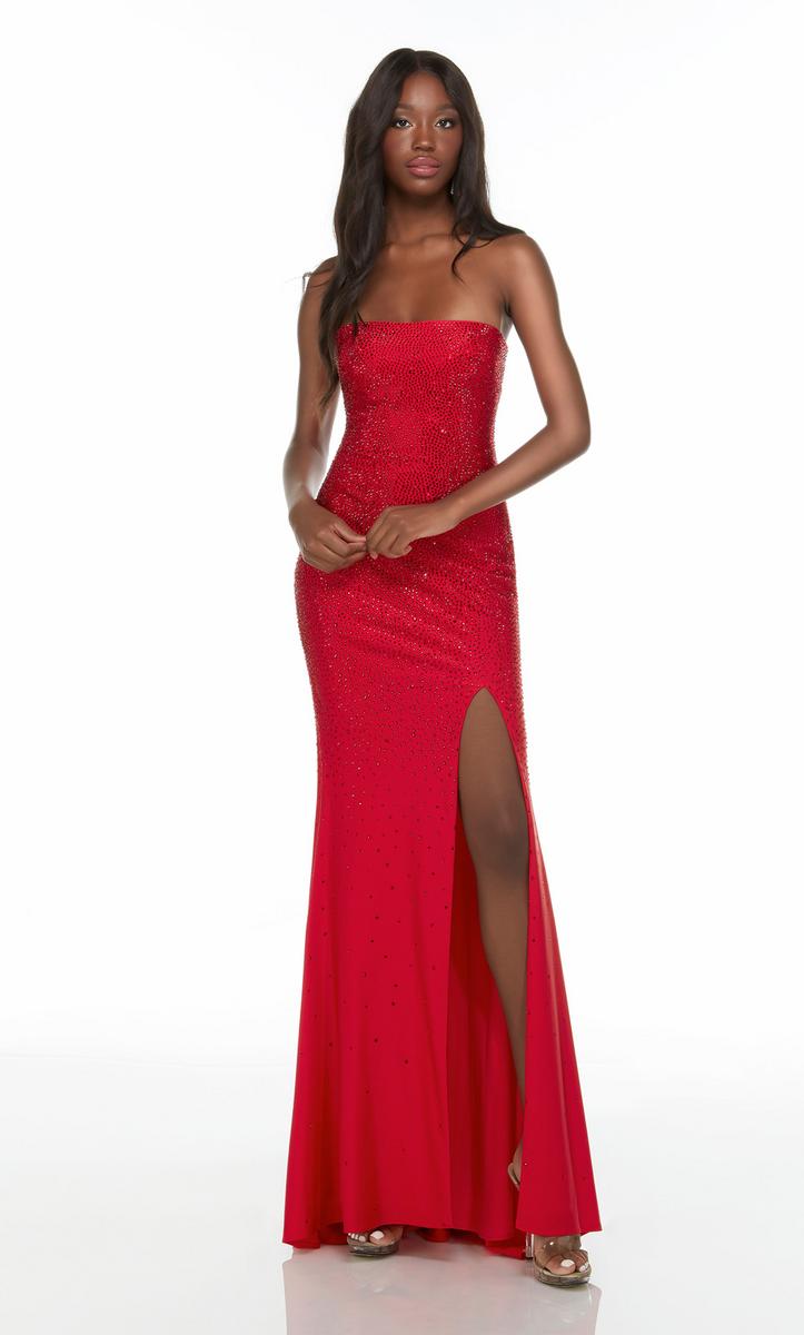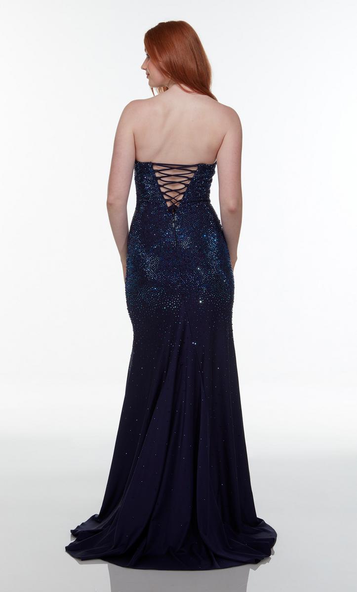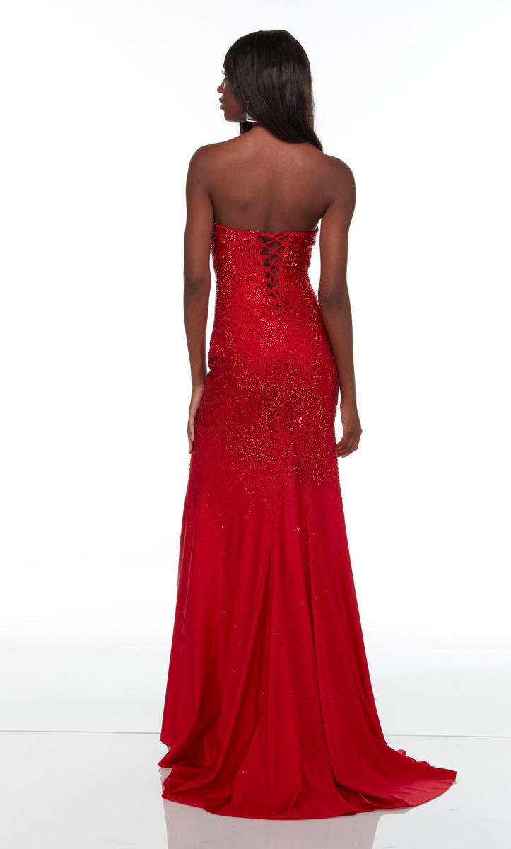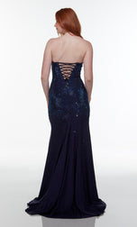 Be on trend with this gorgeous fitted jersey gown from Alyce Paris, 61137. A strapless neckline and lace up back complete this gown! A sweep train that will sway with you! This gown is perfect for Wedding guest, Gala or School dance