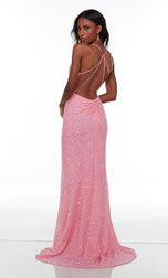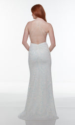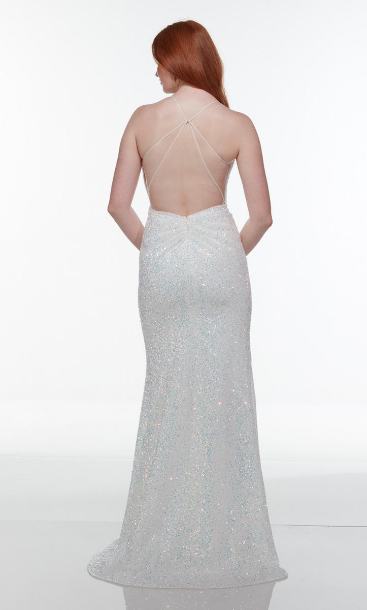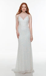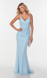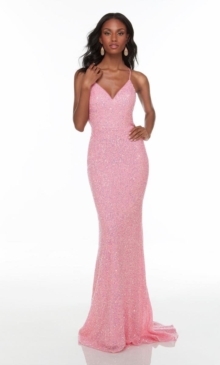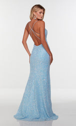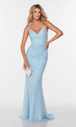 Shine from all angles in this micro sequined formal gown designed by Alyce Paris. 61146, showcases a v-neckline with beautiful open lace up back. Come try this on at Terry Costa!
